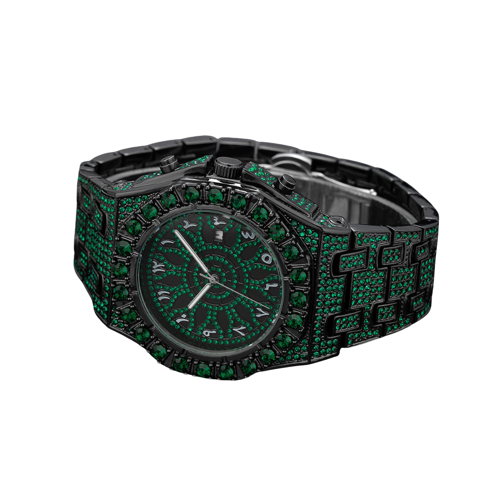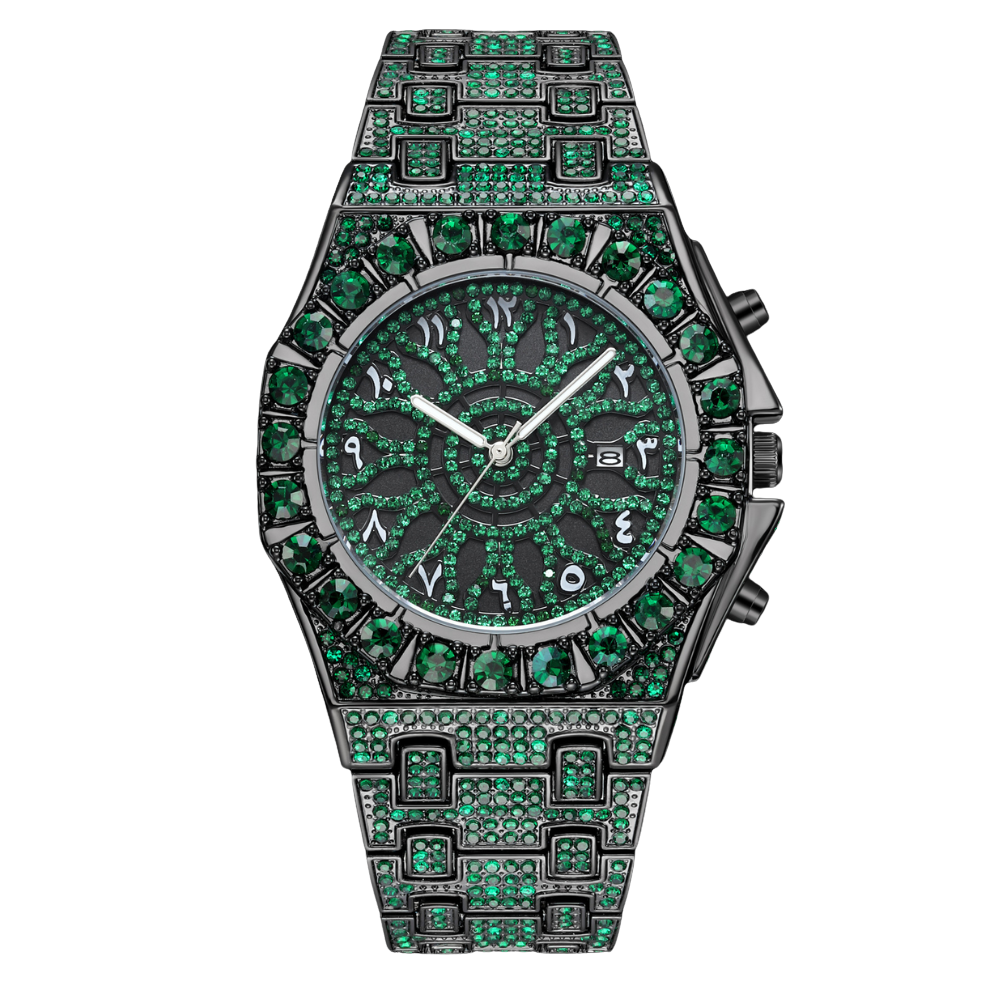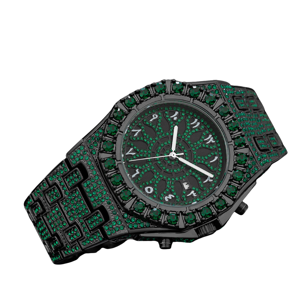 This black-tone wristwatch is designed to stand out with its unique combination of elegance and bold styling. The entire watch is decorated with sparkling green stones that create a powerful visual impact. The round dial features Arabic numeral markers with matching crystal detailing, adding a cultural and stylish touch. A date display window provides extra functionality, while the bezel and strap are fully encrusted with crystals for a seamless and luxurious finish.
