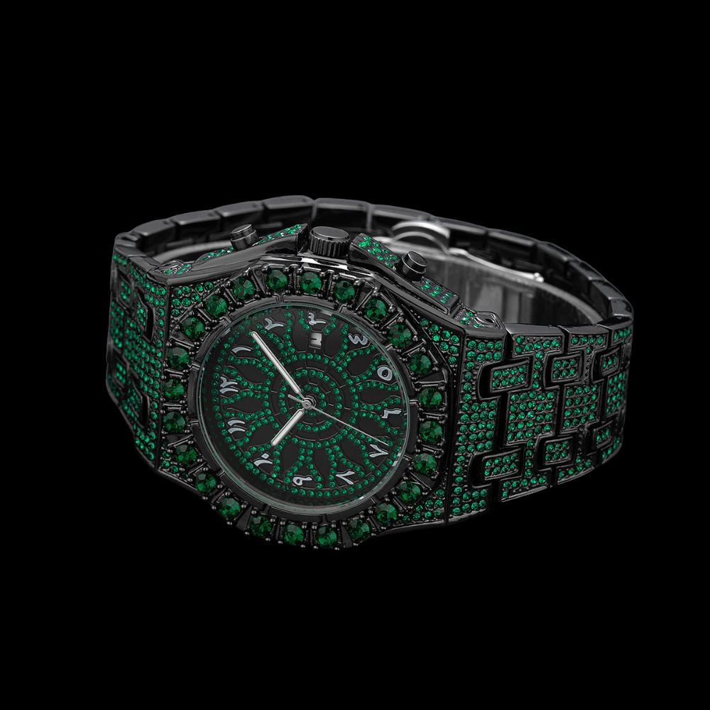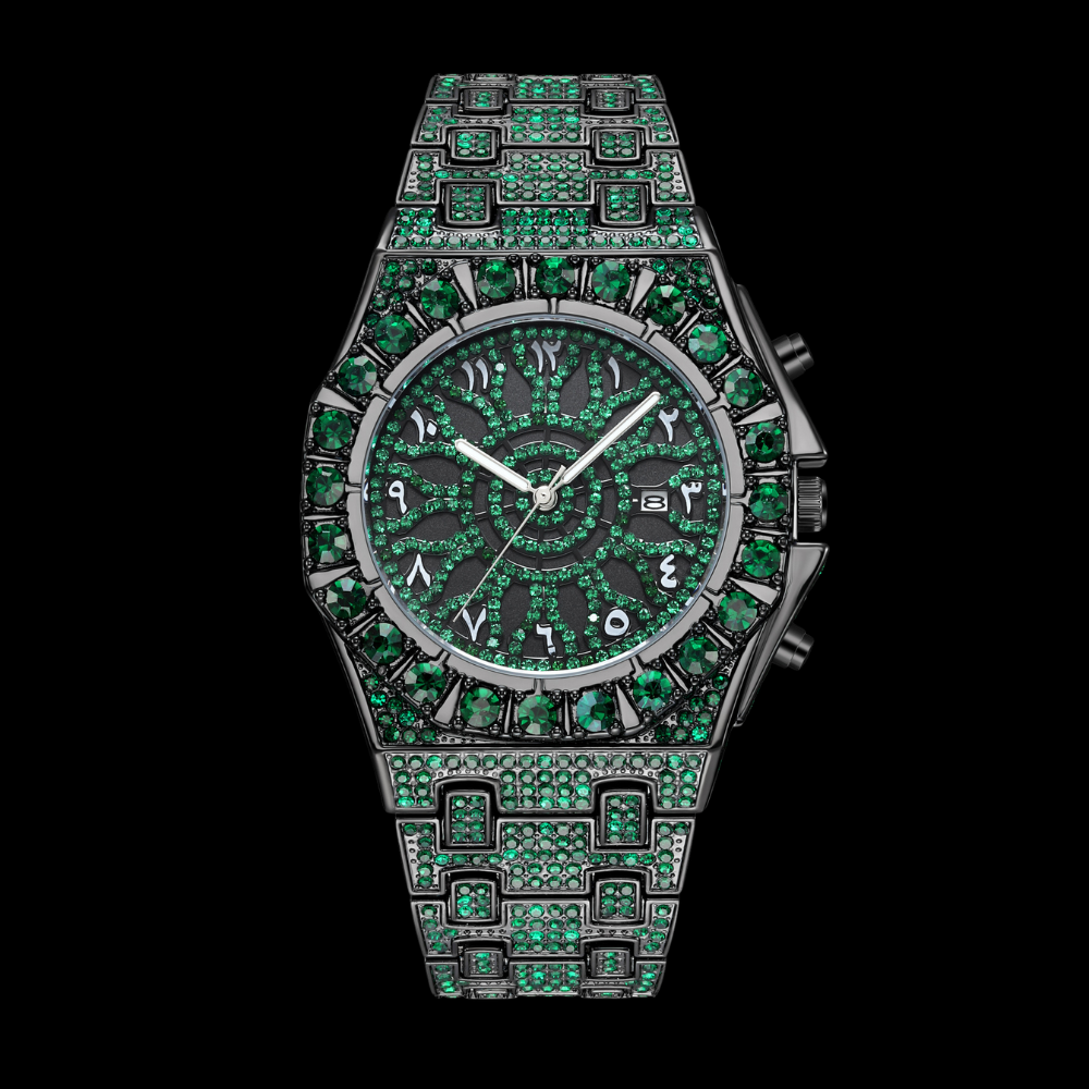 This black-tone wristwatch is designed to stand out with its unique combination of elegance and bold styling. The entire watch is decorated with sparkling green stones that create a powerful visual impact. The round dial features Arabic numeral markers with matching crystal detailing, adding a cultural and stylish touch. A date display window provides extra functionality, while the bezel and strap are fully encrusted with crystals for a seamless and luxurious finish.