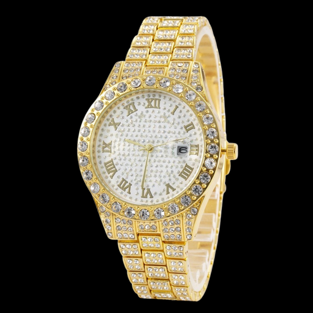 Add a touch of elegance to your style with this gold-tone wristwatch, featuring a stone-studded dial, crystal-embellished bezel, Roman numeral markers, and a date display. Perfect for parties, events, and everyday fashion.